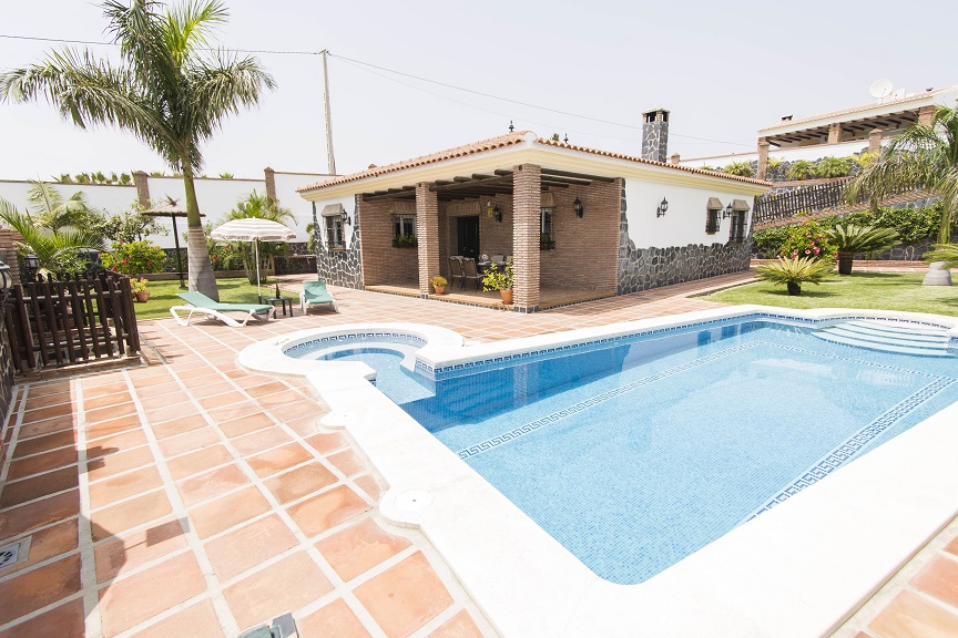 Casa rural CLIMATIZADA, casa de vacaciones en la costa del sol, en Nerja, en parcela de 700 m2. Zonas ajardinadas y vistas a la montaña y al mar. Piscina PRIVADA CLIMATIZADA, YACUZZIS... Máximo 6 personas.